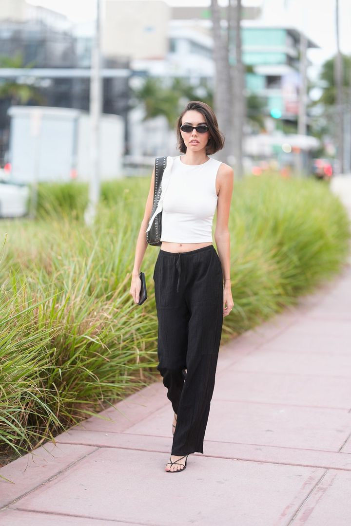 透け感のあるトップスやノースリーブに、ワイドパンツをさらりと合わせたミニマルなスタイルが、この夏の気分。足もとは、シンプルながらモードなトングサンダルで抜け感を添えるのが正解。今季のおすすめは、都会的なムードを引き立てるブラック。アクセサリーはあえて控えめに、ミニマルなスタイリングを意識して。
