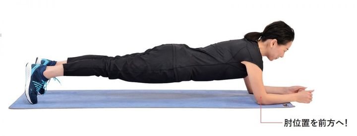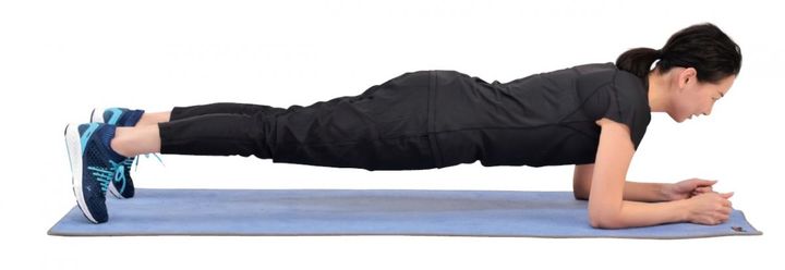 前腕と肘を床に付けて伏せる姿勢をとります。横から見たときに、肘が肩の真下あたりにくるのが基本姿勢です。脚は肩幅くらいに開き、両脚を伸ばし、頭の先からカカトまでがまっすぐになるような姿勢をつくります。この状態のままで30秒から上級者では数分キープします。