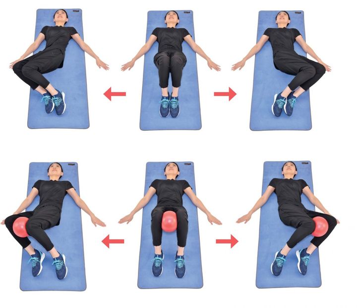 仰向けになり、両脚を揃えて膝を曲げます。両腕を広げて上半身が動かないように支えながら、腰を左右にゆっくりとひねります。おなかに力を入れて行うとより効果的です。慣れてきたら膝の間に柔らかいボールを挟み行いましょう。両手を上に上げて行ってもOKです。