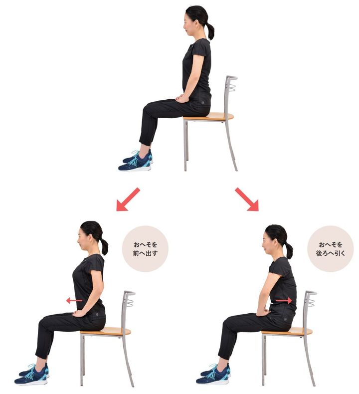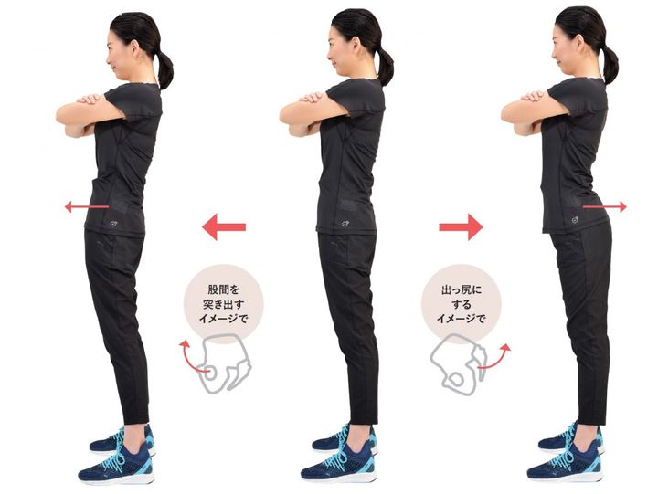 おへそを引っ込めて股間を突き出します。次に、お尻を思いきり後ろに突き出してください。これを5往復行いましょう。
