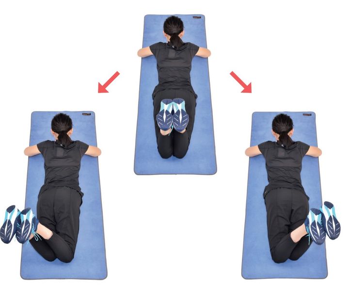 うつ伏せになり両膝の間隔を握りこぶしひとつ分くらい広げ、脚のスネを平行にして自動車のワイパーのように動かします。左右の脚が揃わずに、多少バラバラになっても気にせず、おへそをしっかりと床に密着させる意識で行います。やりにくいときには膝の間を20㎝くらいに広げて行いましょう。