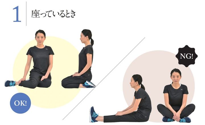 イスを使わないで座るときは、正座がおすすめです。その理由は、自然と背すじが伸びる位置に骨盤がくるからです。いっぽう、長座(両脚を前に投げ出して座る座り方)と、あぐらは、背すじが丸くなるため腰によくありません。膝を崩した座り方は、左右のバランスが崩れるので、時折、脚を左右に組み替えるようにしましょう。