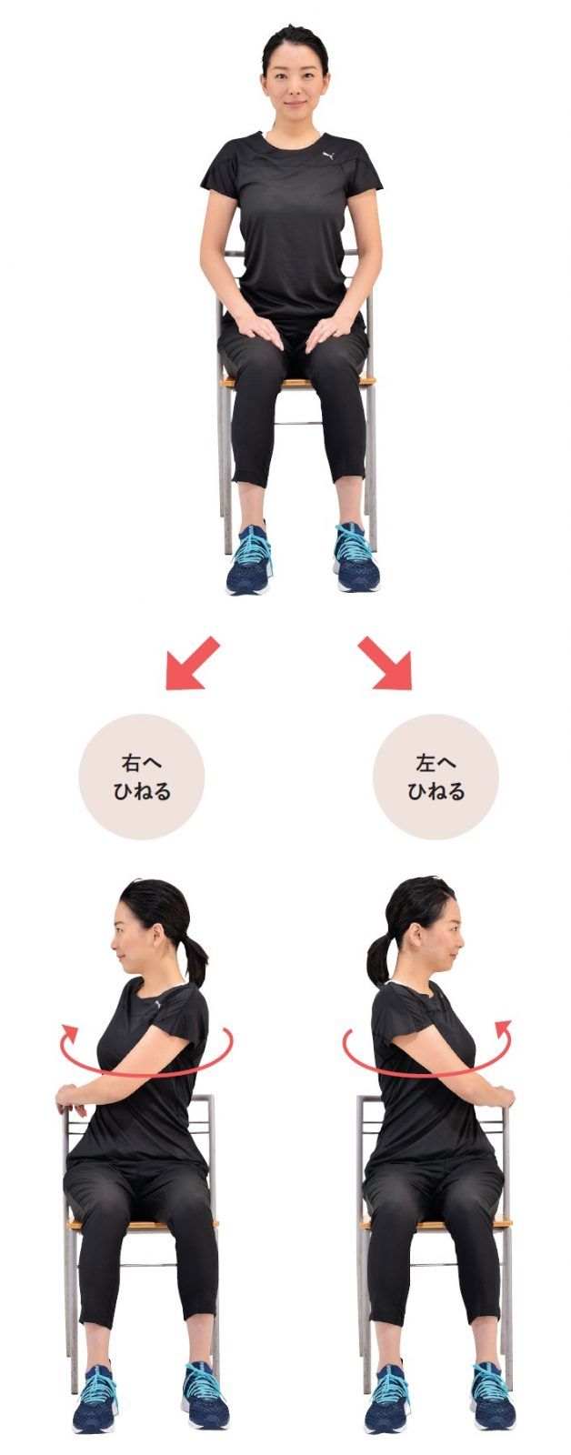 背もたれなどを利用して、ひねれるところまで体をひねりましょう。体の左右の筋肉の緊張(硬さ)に差があると、ひねれる角度にも差が出てきます。無理は禁物ですが、なるべく左右均等に大きくひねれるようになることが目標です。ひねりきったところで少し止めてストレッチしましょう。