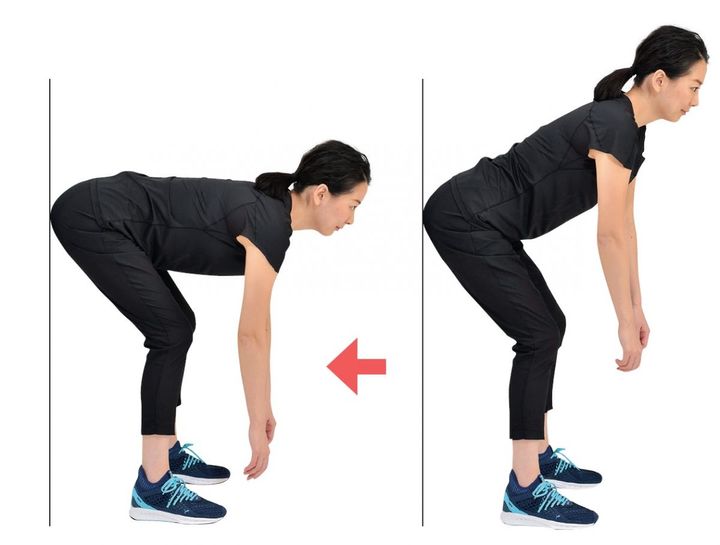 壁で慣れてきたら、壁なしで行います。お尻を後ろに突き出していく感じです。かがんだときに太腿の裏に伸ばされている感じが得られればOK です。背中が丸くならないこと、膝から下は固定して動かさないことが大切です。
