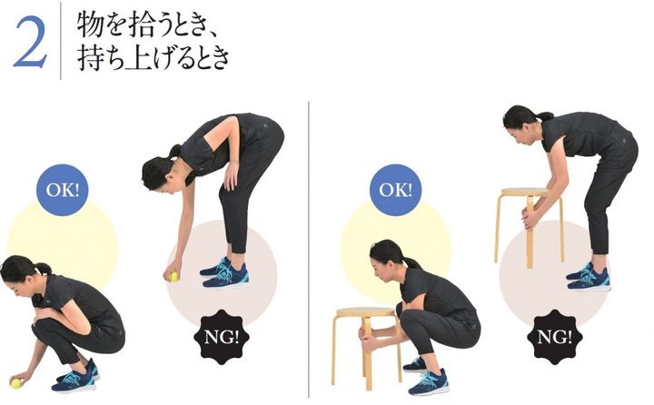 物を持ち上げるとき、かがむときの姿勢に気をつける(とくに、膝を曲げずに重い物を持ち上げるのは危険)。