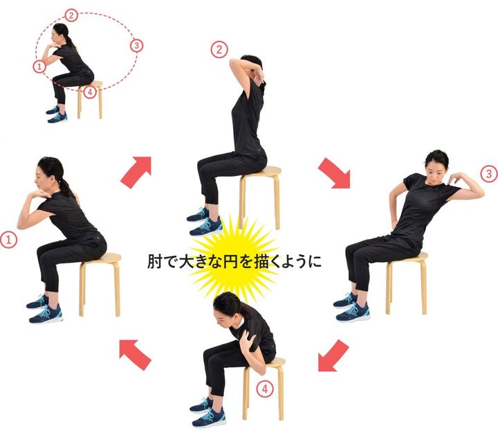 背すじを伸ばしてイスに座り、片方の手を肩(鎖骨と腕のつなぎ目あたり)に添えます。反対側の手は、どこに置いてもOKです。その状態のままできるだけ大きく肘で宙に円を描くように、前から上、後ろから下へと順繰りにゆっくりと回していきます。このとき、背中全体がねじれながら動いていることを意識してください。