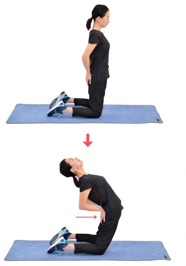 床に膝をついて肩幅程度に開きます。ウエストではなく、お尻を覆い隠すように両手をお尻に当てます。息を吐きながら、骨盤を前に押し出すイメージで、ゆっくり上体を後方に反らしていきます。アゴは引かずに、むしろ上げるイメージで。上体を反らしたまま、その姿勢を3秒ほどキープします。