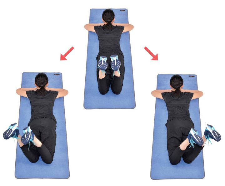 両脚を揃えて膝を付け、脚のスネを一つに束ねて自動車のワイパーのように動かします。これは中級よりもさらに上半身を床に密着させないと腰が浮き上がってしまいます。おへそをしっかり床につけて、腰が浮き上がらないようにして腰をひねりましょう。