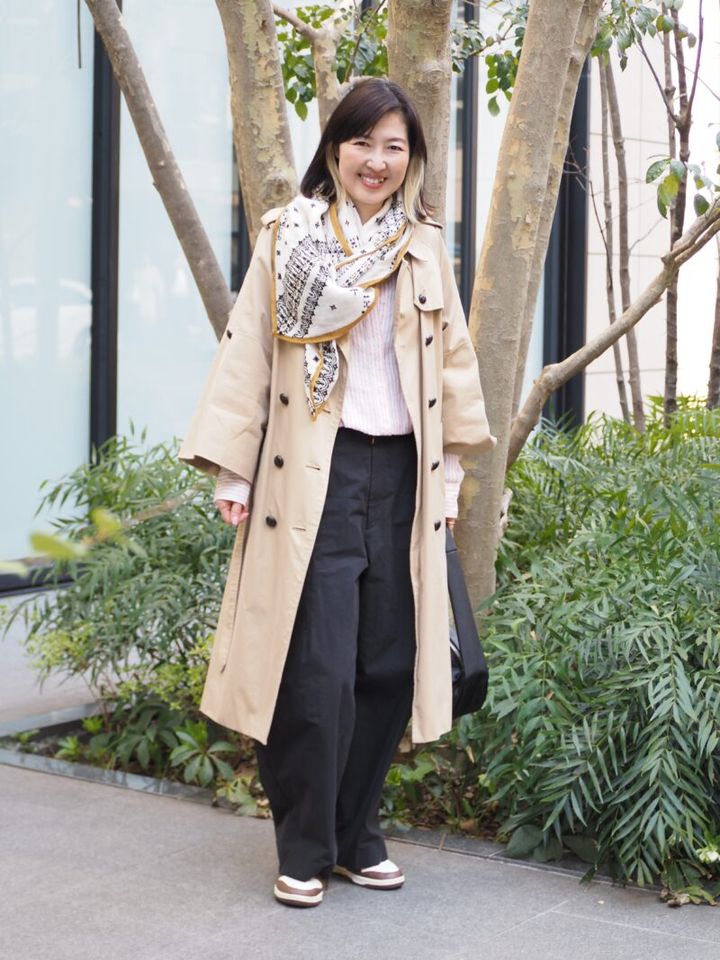 春はトレンチコートの出番! 市岡さんが着用していたのは、素材や品質にこだわったクラシックなアイテムが大人世代から支持を受ける「アナカ」のコート。シンプルで落ち着いた雰囲気の着こなしにストールのアレンジをきかせて洗練度アップ!