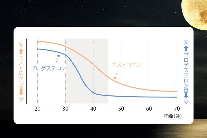 どちらの女性ホルモンの分泌量も20代でピークを迎え、40〜50代で急激に減少。50歳前後でエストロゲンが分泌されなくなると閉経に。閉経前後5年間は、肌だけでなく心身もゆらぎやすく、さまざまな不調を自覚するように。