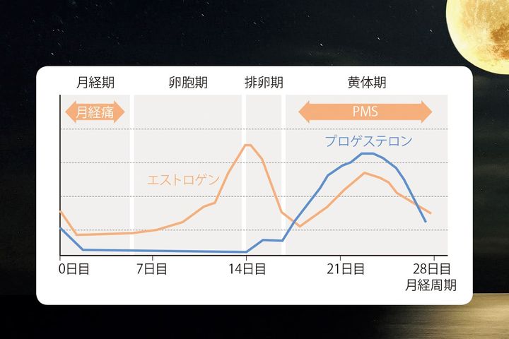 妊娠をサポートする役割を担う。水分保持や皮脂分泌を促すため、むくみやニキビの原因にも。月経前に起こるPMSにも深く関与している。