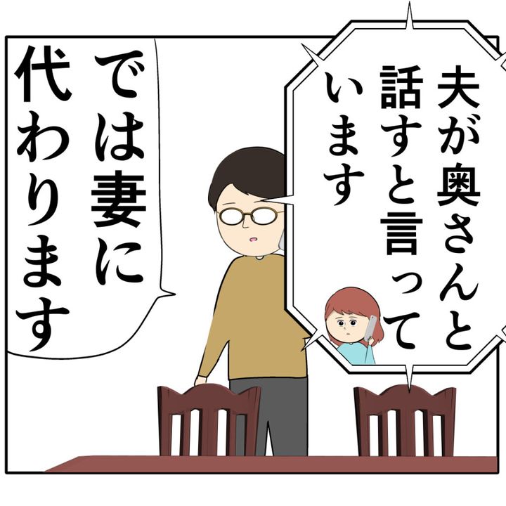 「夫が奥さんと話すと言っています」とめいさんがめが根さんに伝え、めが根さんが「では妻に代わります」と言ってジュリ実さんに電話を代わりました。