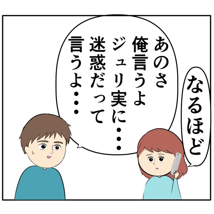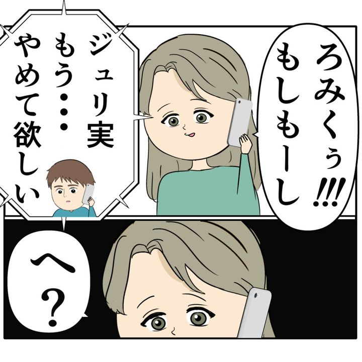 「ろみくぅ!!!もしもーし」電話に出たジュリ実さんは、3人の重い空気を全く感じていないかのように嬉しそうに明るい声でろみ緒さんに話しかけました。それに対し、ろみ緒さんは「ジュリ実、もう・・やめて欲しい」と静かに言いました。予想外のろみ緒さんの言葉に「へ?」ときょとんとするジュリ実さん。