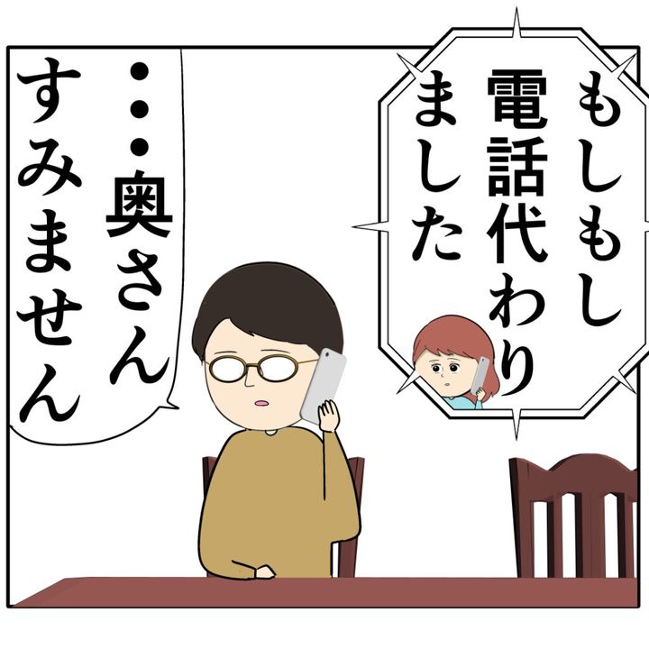 立ち直れないろみ緒さんに代わり「もしもし。電話代わりました」とめいさんが電話に出ました。「・・奥さんすみません」とめいさんに謝るめが根さん。