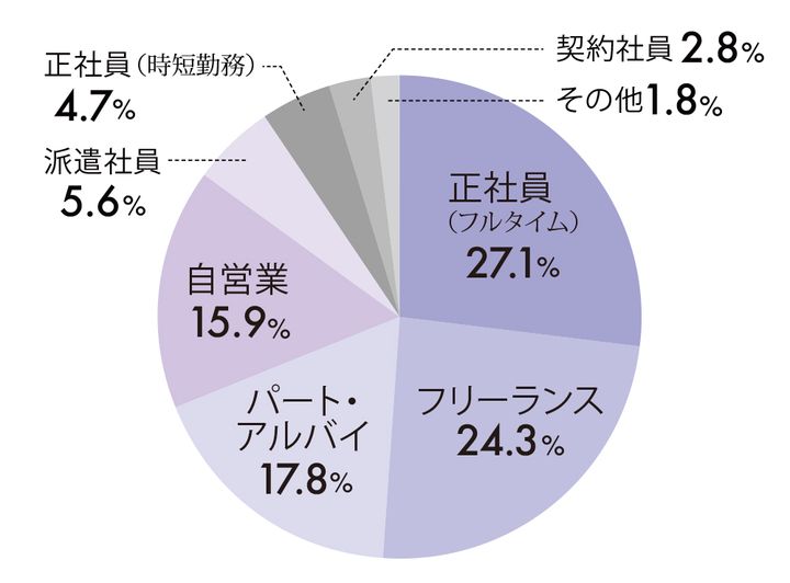 数年前と比較すると、仕事へのコミットやセルフアップデートが必須なフルタイムの正社員、フリーランスや自営業の比率が高くなっているのが印象的。