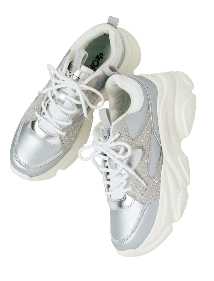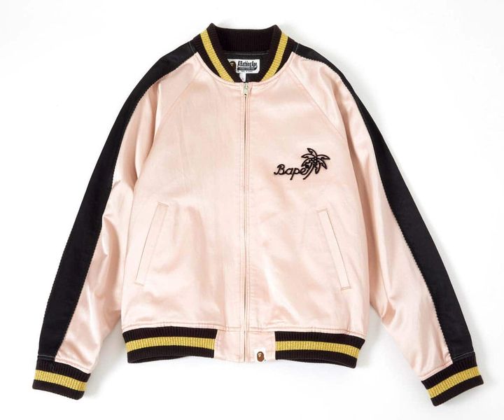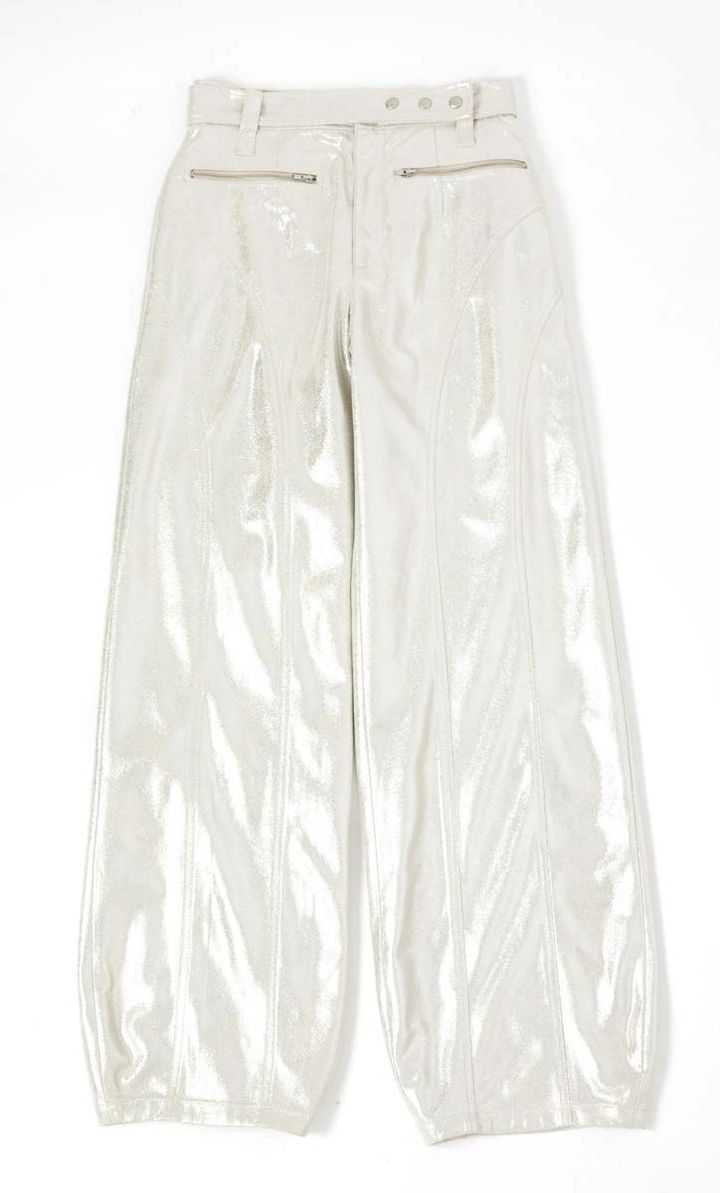 【上から】踊りだしたくなるような、Y 2Kっぽ光沢カーゴパンツでパワーチャージ! ¥14, 300/ラグア ジェム(バロックジャパンリミテッド)、ギラついたメタリックの厚底スニーカーで、足元からしっかり盛ってこ〜! ¥8,800/オーアールティーアール(ダブルエー)、サテン生地×刺しゅうのワンポイントで、ラフだけど高級感のあるコーデが完成。¥60,500/A BATHING APE®(BA PE STORE® 原宿)