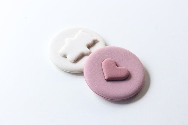『キュートメイクアップパフ(2個)』は、ハートとくまちゃんモチーフのキュートなデザインのメイクパフ。2個入りで110円(税込)です。