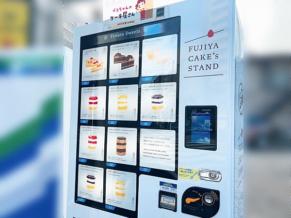 「FUJIYA CAKE’S STAND」は、不二家のケーキが24時間、365日気軽に購入できる冷凍スイーツ自動販売機。去年くらいから見かけるようになり、前を通るたびに気になっていました。