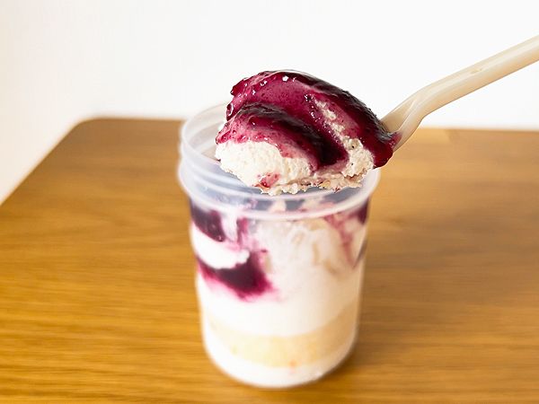 「スイーツボトル(ブルーベリー&クリームチーズ)」はこんな感じ。こちらもしっかりとしたボリュームがあります。ブルーベリーソースがさわやかな味わい。滑らかなクリームたっぷりなのも嬉しいです。