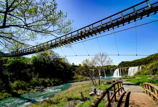 「道の駅 原尻の滝」は、平野部にあり、気軽に立ち寄っていただける道の駅です。日本の滝百選にも選ばれている「原尻の滝」を間近にご覧いただけます。滝の前にかかる吊り橋からは、滝を正面から見ることができますよ。高いのが苦手な方は少しドキドキするかもしれませんが、おすすめスポットです!