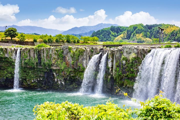絶景ポイントは、田園地帯に突如出現する、幅120m、高さ20mの「原尻の滝(はらじりのたき)」です。この滝は、9万年前に起きた阿蘇山の大噴火による火砕流によってできたといわれています。