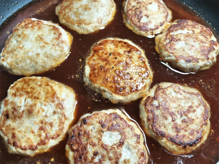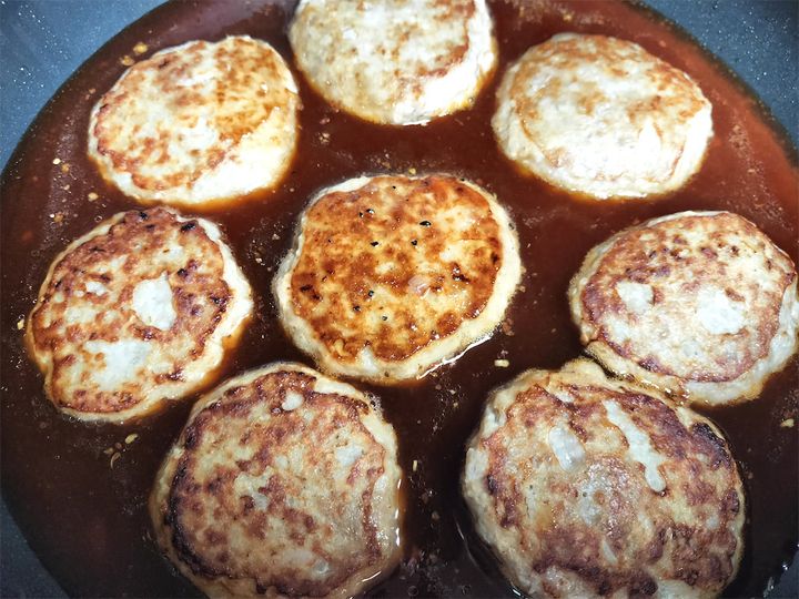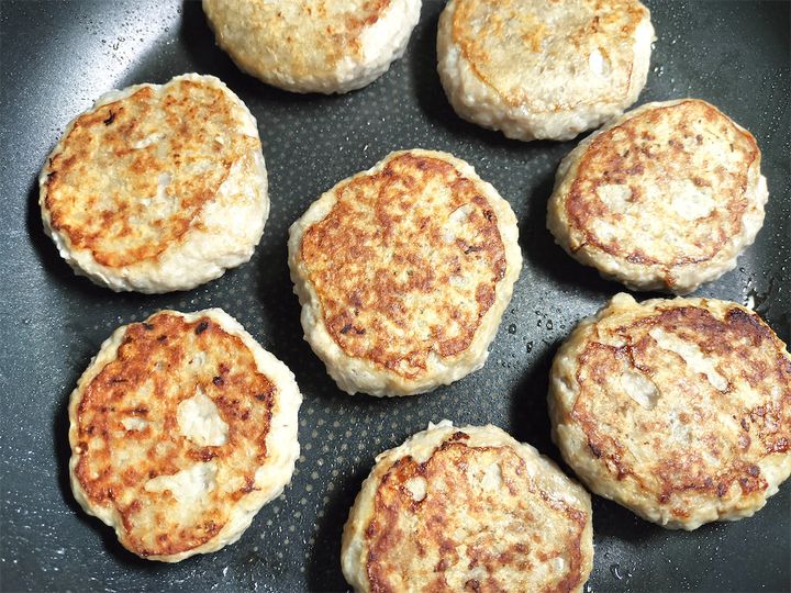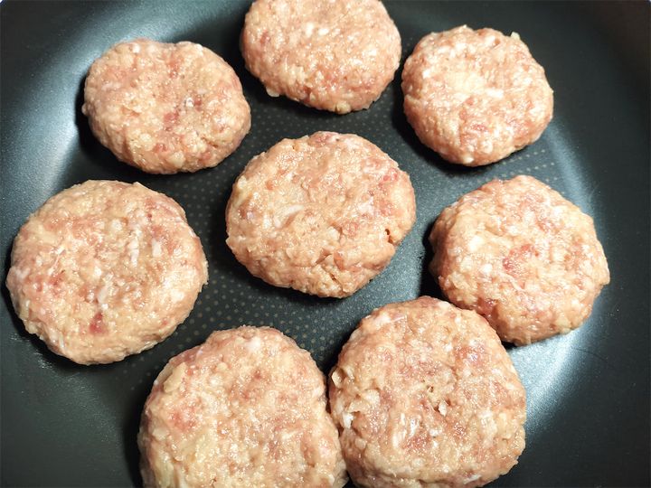 4. フッ素樹脂加工のフライパンに油を引かずに3の丸めた肉だねを並べ、フタをして弱めの中火で3~4分焼きます。