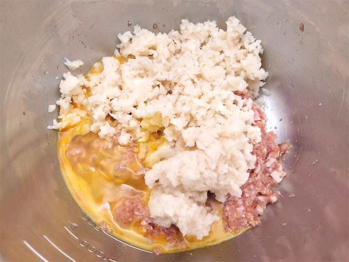 2. 肉が締まってきたらすりおろしたれんこん、みじん切りのれんこん両方と卵を入れて、さらに混ぜ合わせます。