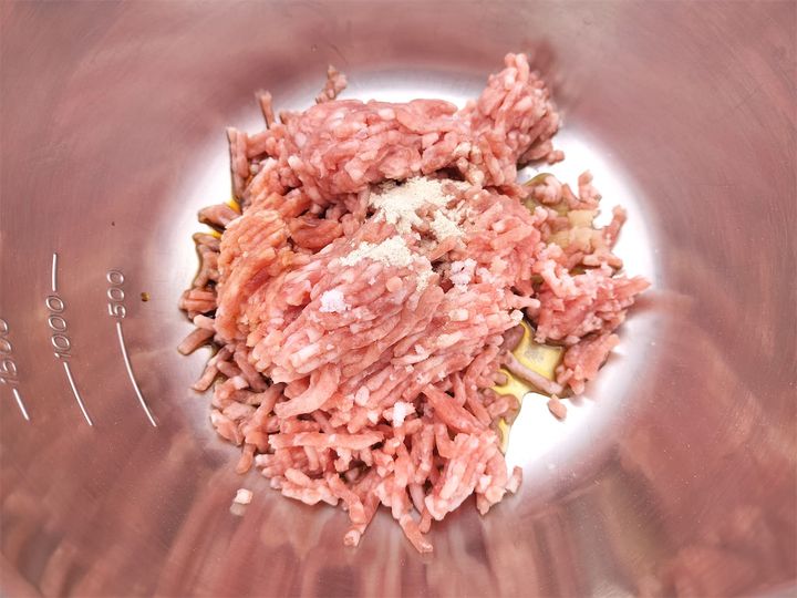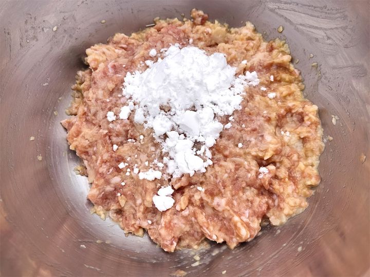 1. ボウルにひき肉を入れ、紹興酒、塩、白こしょう、しょうゆを加えてよく練ります。