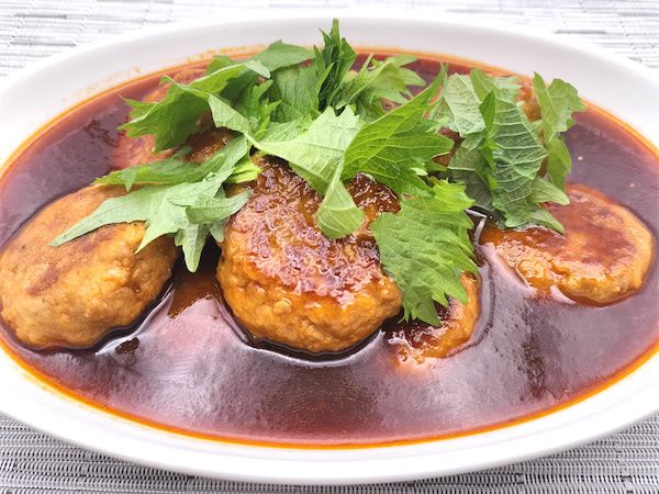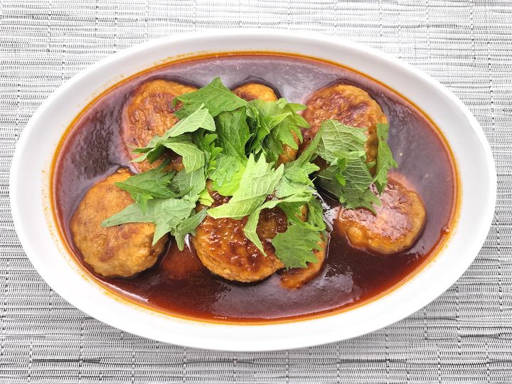 小さめでかわいいハンバーグが出来上がりました。食べてみると甘酢あんかけのような甘みと酸味のバランスがよく、しっかりした食感のハンバーグによく合っていましたよ。ハンバーグ自体にしっかり下味がついていますが、ソースに絡めることでコクが加わって余計においしく感じられます。煮詰めすぎるとしつこい味になってしまいそうなくらい濃いソースですが、青じそがとてもさっぱりしていておいしい一品です。