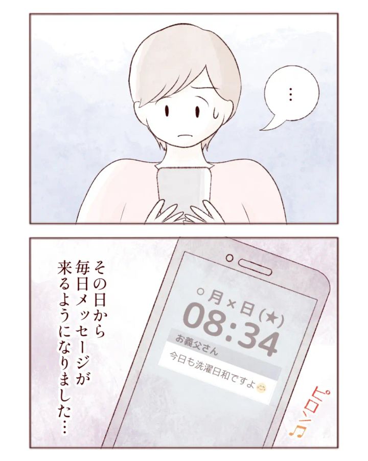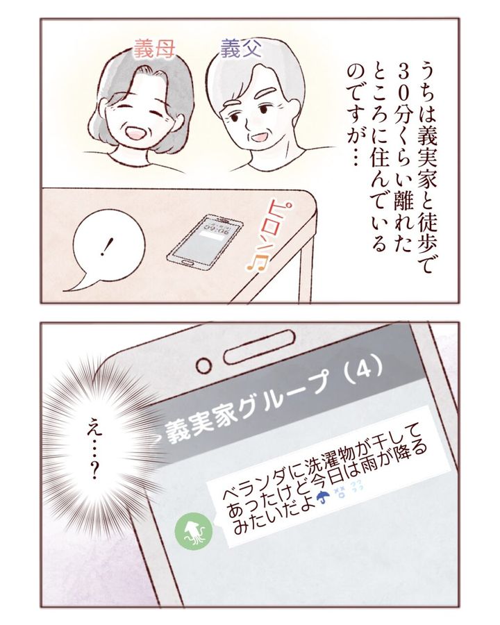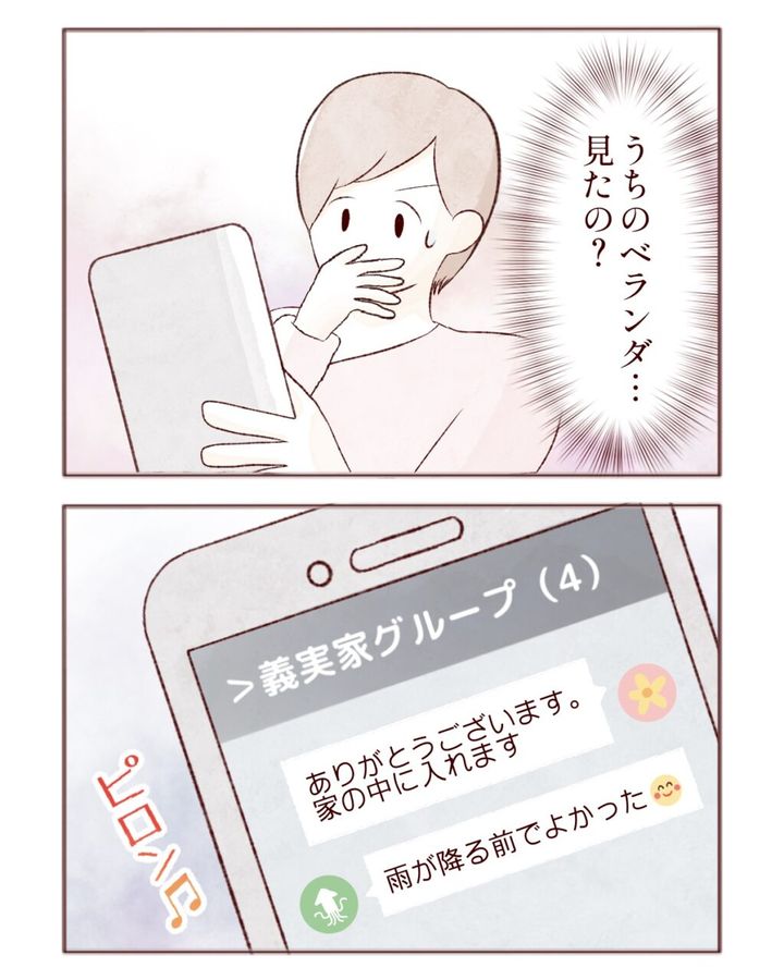 「30分も離れているのに・・うちのベランダ・・見たの?」そう思い愕然とするカナコさんは、驚きながらも「ありがとうございます。家の中に入れます」と返信、するとすぐに「雨が降る前でよかった」と義父からメッセージがありました。