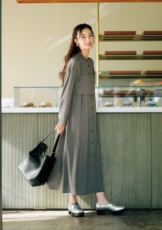 小物で味付けしやすいシックな色チョイスで媚びない可愛さを演出。