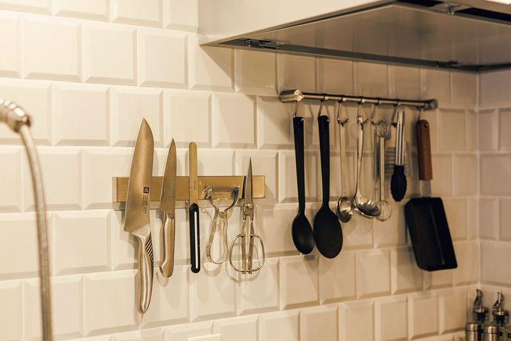 どうしても、ごちゃつきやすいキッチン周り。後付けできるハンギングバーとマグネットでツールを収納すればすっきり。使いたいときに、さっと手に取れる点も嬉しいポイント。(田中 萌さん・化粧品会社勤務)