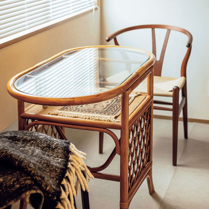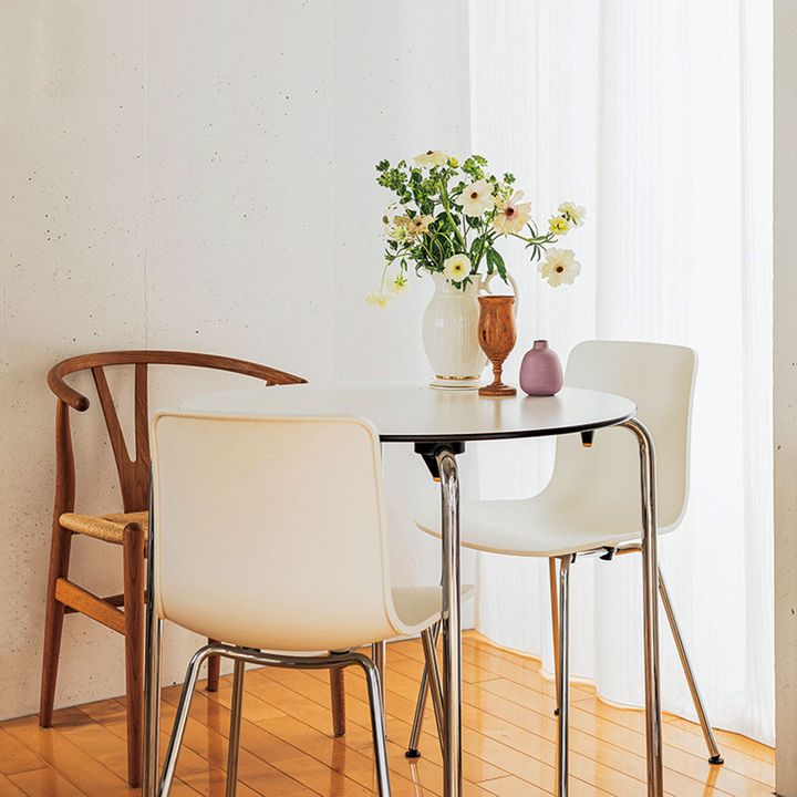 角形より置く場所を選ばず、テーブルを囲む人数も融通が利きます。天板が折り畳めるドロップリーフタイプは、壁に寄せられて便利。(田中 萌さん・化粧品会社勤務)