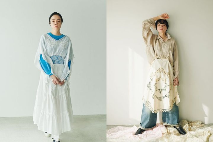 ヴィンテージレースから着想を得たエレガントなワンピース。透け感×鮮やかなスウェットが軽やかで涼しげ。スニーカーで抜け感をプラスし、リラックスムード漂う装いに。