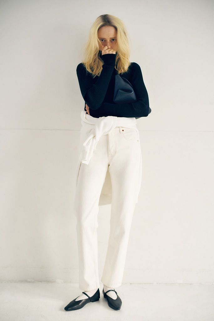 【POINT】美脚デニムを主役にした抜け目のないモノトーンを構築。アイテム自体の形を研ぎ澄ませば、テクニック不要で洗練された見た目へ導く。