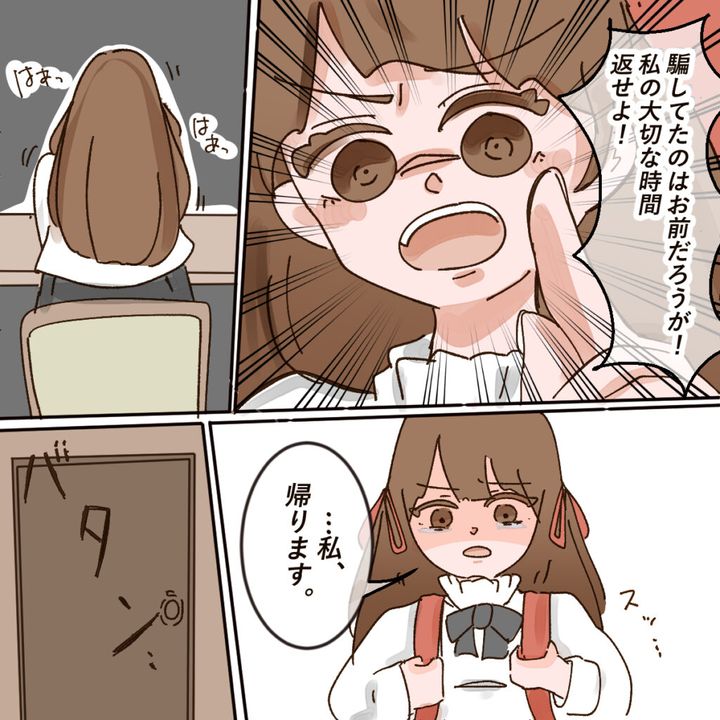 「騙してたのはお前だろうが!私の大切な時間返せよ!」と大きな声で言った後、「・・私、帰ります」そう言うと、バッグを背負って家から出て行ってしまいました。