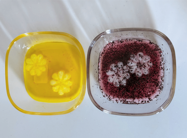 3.食用色素やゆかりで色づけします。浅漬けの素をベースに、黄色は食用色素、ピンクはゆかりを混ぜた液で漬け込みます。残った液はあえものに使います。