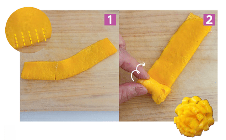 2.端からきつめに巻き、最後に切れ目を入れていないほうをピックなどで刺して固定すれば完成。薄焼き卵の代わりにハムで作ると、ピンクの花に。