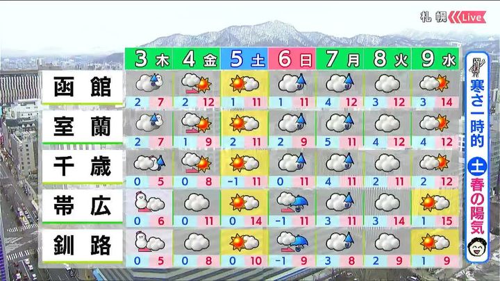 寒さや雪が降る「冬らしい天気」はあす3日(木)だけです。金曜日はしだいに晴れて、土曜日は春の陽気となります。帯広は土曜日14度まで上がるでしょう。来週も気温が高めです。曇りや雨の降る日が多くなりそうです。
