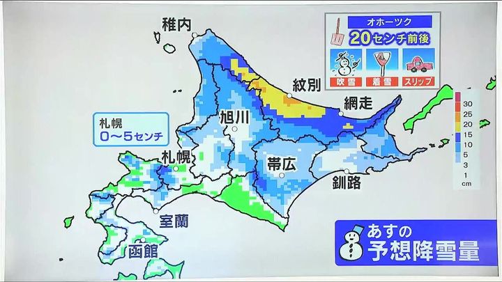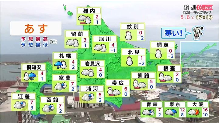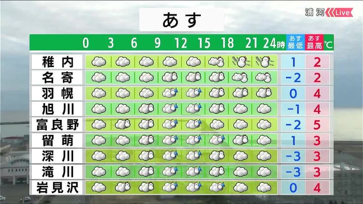 湿った雪が降り、道東方面を中心に風も強まるでしょう。最低気温はけさとほぼ同じですが、最高気温は日本海側やオホーツク海側で今日より5度前後低くなります。札幌の最高気温は4度など寒くなります。