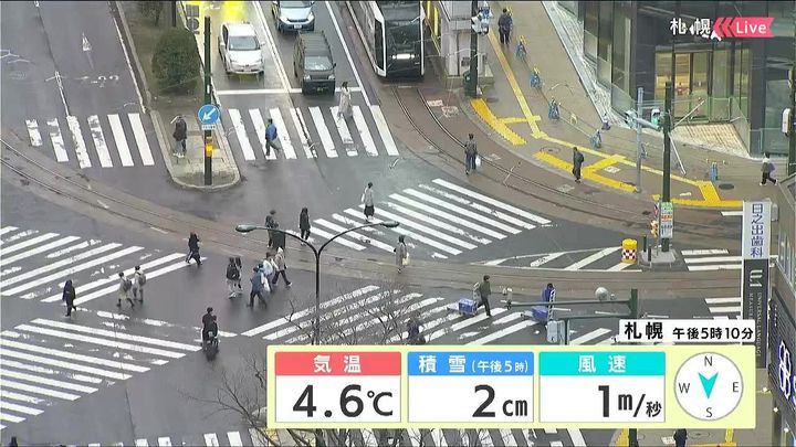 札幌では路面が濡れています。今夜も小雨がパラつき、あすは雪がまじりそうです。