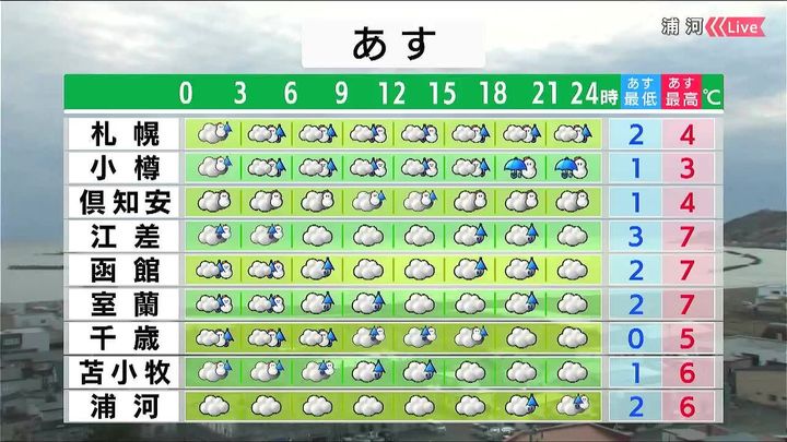 札幌や小樽、倶知安は雨や雪が降りやすく、傘が必要です。山沿いではうっすら積もるでしょう。函館や室蘭も朝晩を中心に雨や雪が降りそうです。
