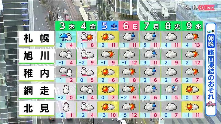 金曜日も午前を中心に雪が降り、道北やオホーツク海側ではさらに5センチ前後の雪が降りそうです。土曜日は行楽日和ですが、最低気温は0度前後なので、路面凍結に注意して下さい。