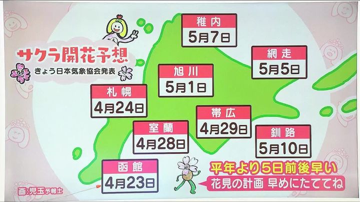 最新のサクラ開花予想。きょう2日(水)日本気象協会から発表されました。平年より5日前後早く、函館は4月23日、札幌は4月24日で、あと3週間ほどです。サクラちゃんも言ってますが、今年も花見の計画は早めに立てましょう。