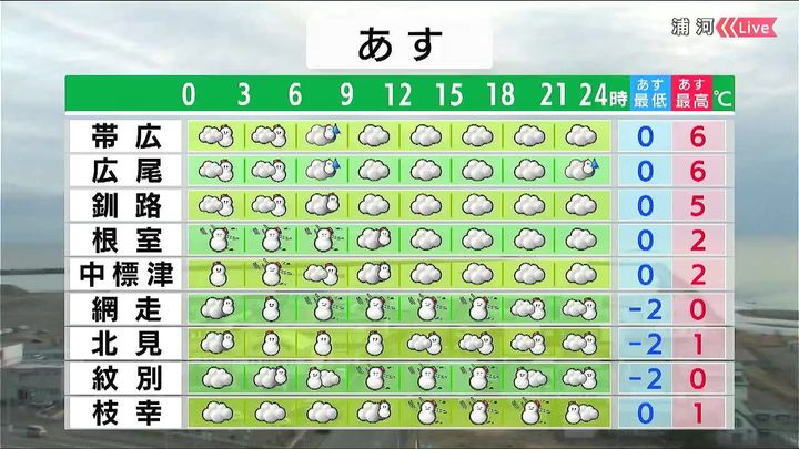 道東は朝まで広く雪が降り、路面凍結やふぶきにも注意が必要です。オホーツク海側は一日を通して雪が降り、ふぶくでしょう。網走や紋別の最高気温は0度と3月上旬並みの寒さです。
