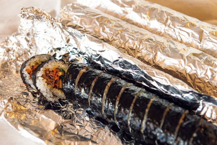 「テテのお母さんが作ってくれたオンマキンパのオマージュです。韓国のキンパってホイルに包んであって、気軽にパクパク食べるんですよね。テテ気分でどうぞ!」