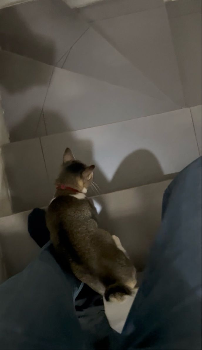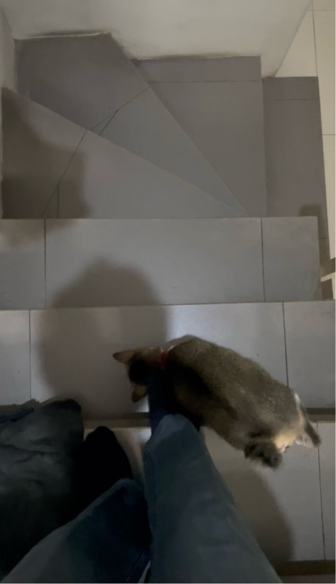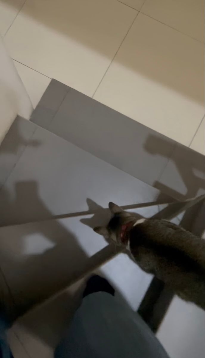 階段の真ん中に立っているネコ。 飼い主さんが足を前に出して階段を下り始めると・・・、この子もぴったりくっついてきました!