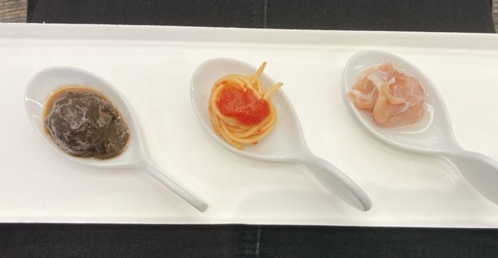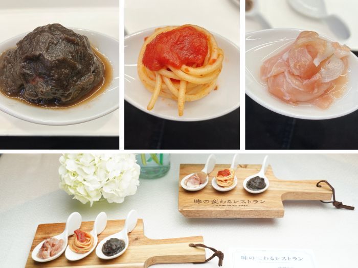 「味覚が変化した状態」を疑似体験するために「味の感じにくさ」を前提に考案された特別な料理を試食しました。右から、味の変わる生ハム、味の変わるパスタ、味の変わるハンバーグ。 食べてびっくり。味がしないものもあれば、思っていたのとなんか違う…のです。生ハムはなぜか甘じょっぱく感じ、パスタとハンバーグは、私は何の味も感じませんでした。塩味も甘みもなく何を食べているのかわからないという不思議な感じです。