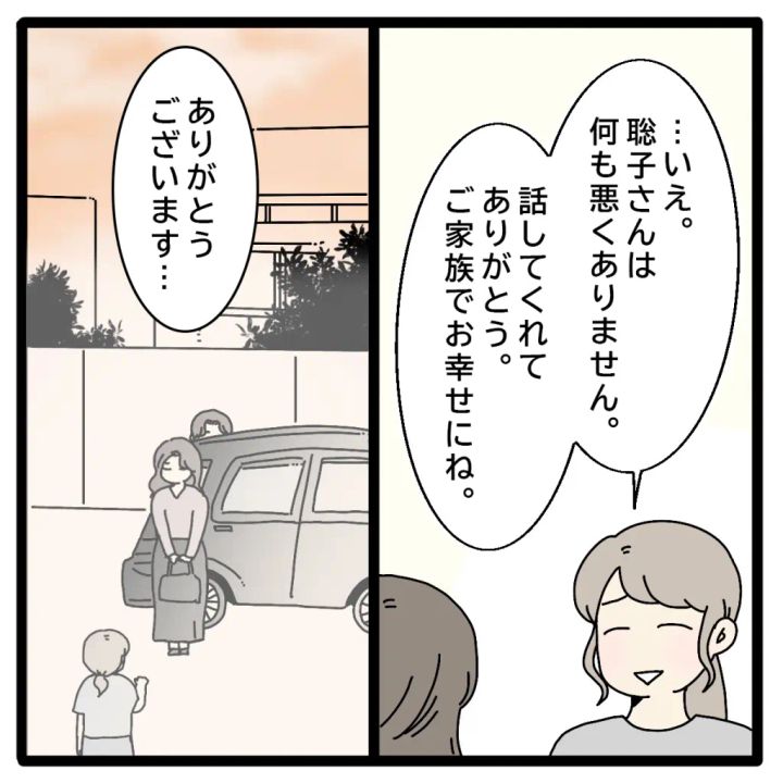 理恵さんは「・・・いえ。聡子さんは何も悪くありません。話してくれてありがとう。家族でお幸せにね」と言い、美沙さんと聡子さんをお見送りしました。