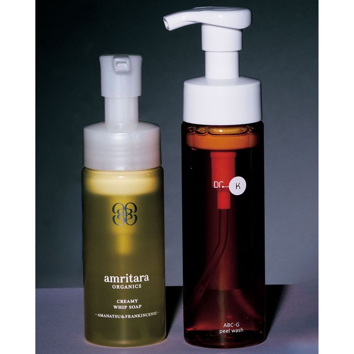 左:きめ細かな泡が肌に密着して、酸化皮脂や古い角質を擦らずともしっかりオフできる。植物由来の潤い成分配合でつっぱり感のないみずみずしい肌に。合成界面活性剤不使用。クリーミー ホイップソープ 甘夏&フランキンセンス150ml ¥3,410(アムリターラ)右:アミノ酸由来の洗浄成分使用で刺激を軽減。もっちりと弾力のある泡で肌を優しく包み込みながら汚れを落とし、ヒト型セラミド配合でハリのある肌に。ドクターケイ ABC-Gピールウォッシュ 200ml ¥4,400(ドクターケイ)